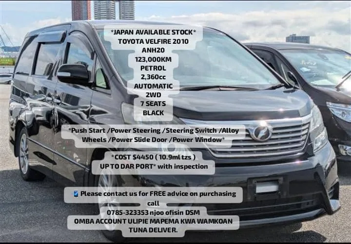 Market Price of Toyota Velfire 2010 Unregistered like this in Tanzania is around TSh 26.5M – 29M. This vehicle is priced about 61% below market value for similar cars.